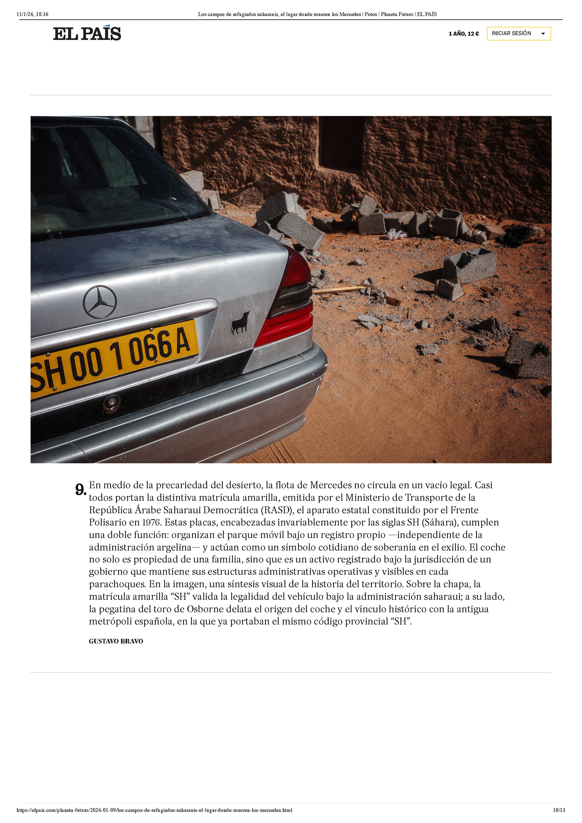 Matrícula SH (Sahara). El vehículo circula bajo la jurisdicción del Ministerio de Transporte de la RASD. Símbolo de soberanía estatal operativo sobre territorio de acogida.